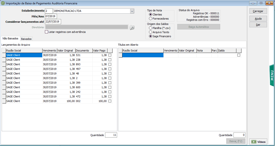 | • | Ao carregar (arquivo, planilha ou Sage Financeiro), serão exibidos na grid da esquerda os títulos/parcelas constantes no arquivo. Na grid da direita serão exibidos os títulos em aberto na Auditoria Financeira neste mesmo período. |