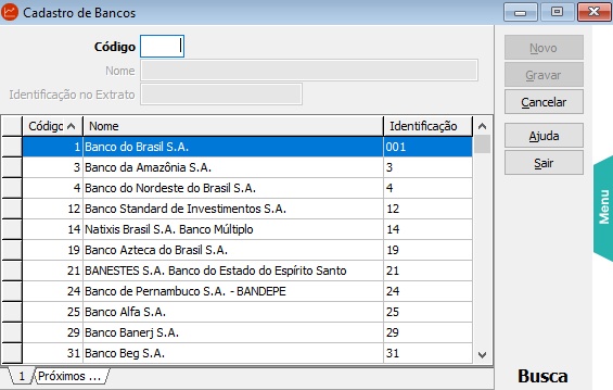 Através desta rotina podem ser cadastrados novos bancos, de acordo com a tabela FEBRABAN.