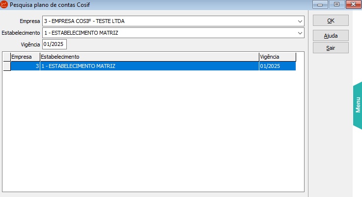 Nesta rotina, será possível pesquisar as empresas, estabelecimentos e vigências já cadastrados na tela Planos de contas Cosif – A partir de 01/2025.